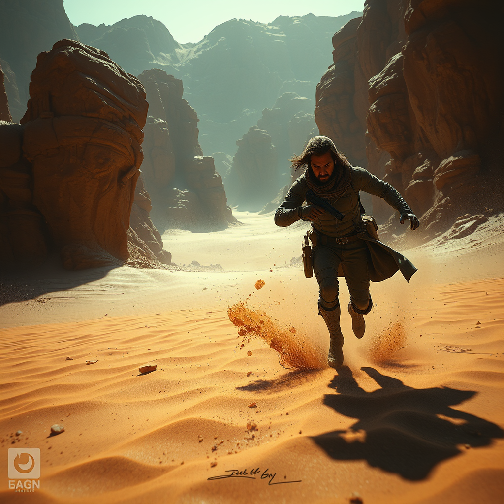 Action scene in a desert landscape with an immersive background, featuring volumetric sand and global illumination. Intense and dramatic lighting enhances the high detail digital painting, showcasing realistic yet stylized elements. The scene is depicted in ultra high resolution, with highly detailed digital artwork utilizing physically-based rendering. Muted colors set the mood, captured through an f2.0 lens, creating a gritty palette. An unexpected twist adds intrigue to the composition.