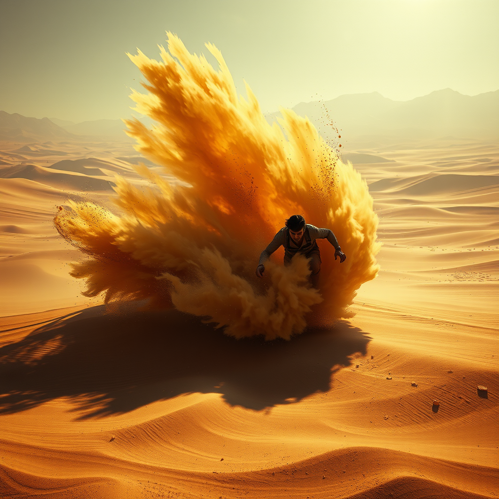 Action scene in a vast desert landscape with an immersive background. Volumetric sand swirls through the air under intense lighting, accented by dramatic shadows. High-detail digital painting showcasing a realistic yet stylized environment. Ultra high-resolution artwork with physically-based rendering. The scene features muted colors with a gritty palette and an unexpected twist. An f2.0 lens focus brings clarity to fine details, creating a palpable sense of grit and intensity.