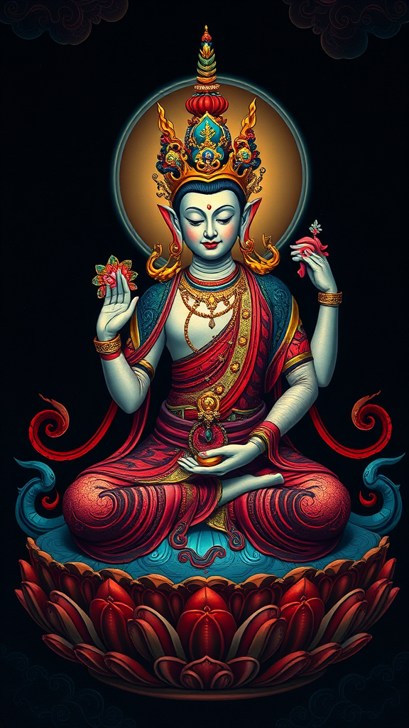 Action shot of a Buddhist Avalokitesvara, showcasing a stunning and gorgeous array of shocking colors that are dazzlingly exquisite. The full body is captured sitting in a mysterious and majestic pose against a dark background, rendered in 8k resolution. Inspired by the intricate style of Katsuhiro and the vibrant charm of Rumiko Takahashi, this thangka illustration features refined color grading and the clarity of a 35mm lens at f/1.8. Enhanced with Accent Octane Rendering, the scene is a breathtaking fusion of spiritual and artistic brilliance.