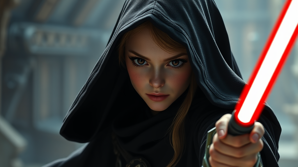 Action shot of Princess Zelda as a Sith lord from Star Wars, wearing dark robes with symmetrical eyes and dramatic lighting. The scene is realistic, in sharp focus, and highly detailed, featuring intricate photography with hyperrealism qualities. Utilizing raytracing and physics-based rendering, CGI is employed to achieve a 3D effect. Elements from doll, cartoon, anime, and illustration styles are subtly blended into the digital art and digital painting. The image maintains high definition, capturing Princess Zelda's powerful, dark presence as a Sith, with no visual errors or deformities.