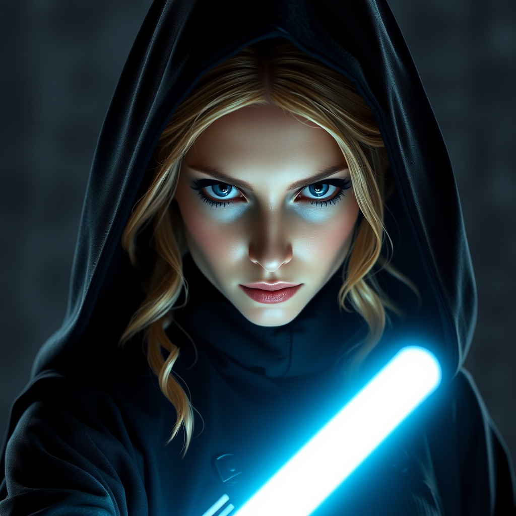 Action shot of Princess Zelda reimagined as a Sith Lord from Star Wars, wearing dark, elegant robes with symmetrical features. The scene is illuminated by dramatic lighting, showcasing a hyperrealistic, highly detailed portrayal. Captured in sharp focus and HD quality, the composition embodies intricate photography and digital art techniques. Using physics-based rendering CGI and 3D elements, the image merges styles from dolls, cartoons, and anime. Creative digital painting ensures realistic anatomy and proportions, avoiding any imperfections or distortions, presenting a compelling and dynamic vision of Zelda within this Star Wars-inspired universe.
