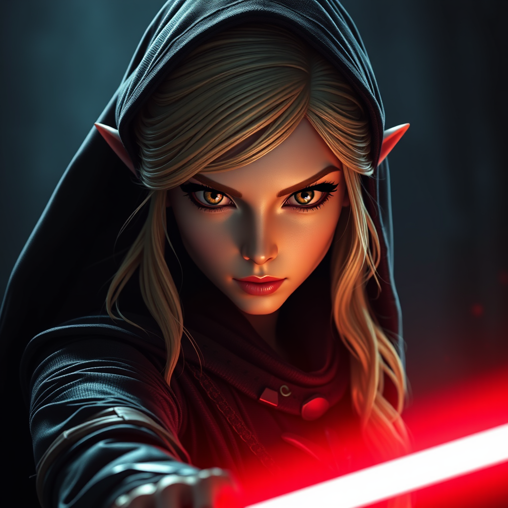 action shot, Princess Zelda reimagined as a Sith lord from STAR WARS, clad in dark robes, with striking symmetrical eyes, dramatic and moody lighting, captured in realistic, sharp focus, showcasing HD quality with highly detailed and intricate features, hyperrealistic photography style, enhanced by raytracing and physics-based rendering cgi, visualized in 3D, blending elements of doll-like precision and anime illustration, digital art and painting combine to create a captivating image.