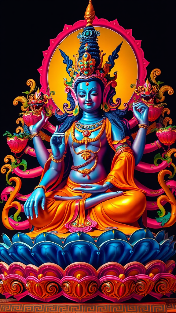 Action shot, stunning Avalokitesvara in vibrant hues, breathtaking and colorful, exquisitely detailed, full body seated in a mystical pose, majestic presence, contrasting dark backdrop, 8k resolution, inspired by Katsuhiro Otomo and Rumiko Takahashi, thangka-style illustration, expertly color graded, captured with a 35mm lens at f/1.8, enhanced with Accent Octane Rendering, cinematic and dramatic.