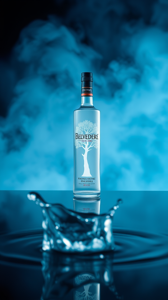 Ad campaign of Belvedere Vodka showcasing a sleek bottle elegantly placed on a reflective glass surface. Bright, ambient lighting accentuates the bottle's intricate details. A subtle, misty background suggests a cool and sophisticated atmosphere. The iconic white tree design glows subtly, emphasizing the premium nature. In the foreground, soft focus highlights a splash of water frozen in motion, symbolizing purity and freshness. The color palette blends crisp whites and cool blues with a hint of metallic silver for a modern, luxurious feel.