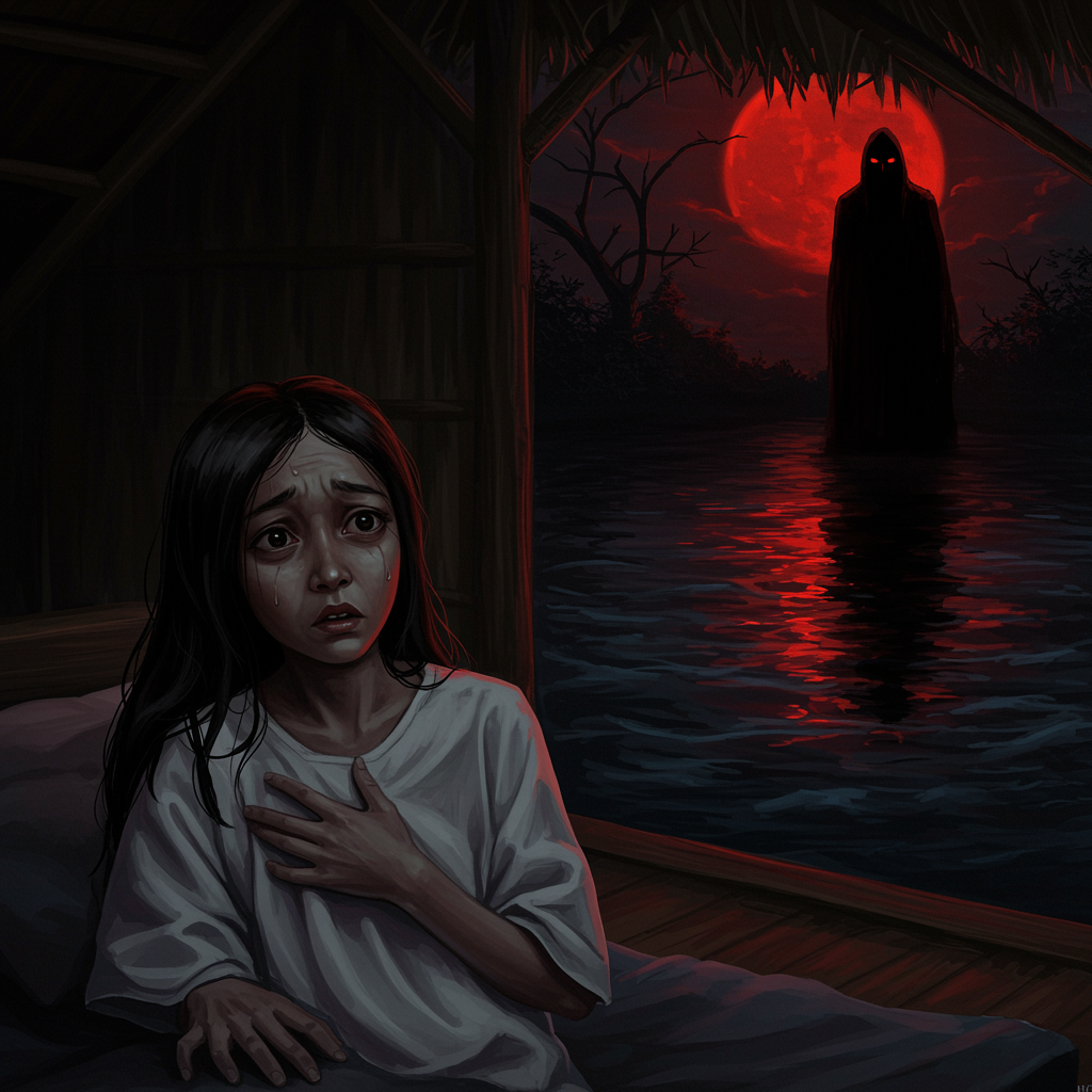 Adaeze, frail and pale, her face glistening with sweat, gazes with terrified, almond-shaped eyes. The simple white nightgown she wears is slightly wrinkled from tossing in her sleep. In the shadowy depths of her mind, a tall, daunting figure cloaked in darkness emerges, defined only by his burning red eyes and faint outline. She sits upright on a wooden bed within the dimly lit hut, her hand pressed firmly to her chest while she envisions the figure by a vast, swirling river. The river's waters are as black as night, catching the eerie glow of a blood-red moon reflected upon its surface. Near the river's edge, the figure stands menacingly, whispering dark, foreboding words that blend with the chilling cries of the wind.