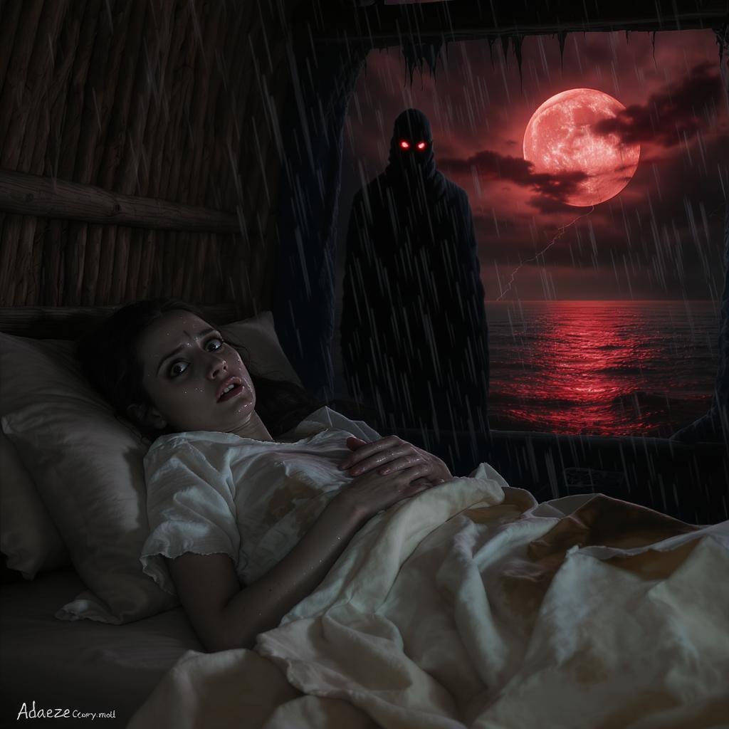 Adaeze, frail and pallid, lay shivering, her forehead glistening with beads of sweat, her large, almond-shaped eyes wide with terror. She was clad in a simple white nightgown, slightly wrinkled from her restless sleep. A tall, menacing figure with indistinct features shrouded in darkness stood before her. Only his eyes, glowing crimson, and his faint silhouette were visible against the dim light. Adaeze sat upright on a wooden bed within a shadowy hut, her hand clutched tightly to her chest as she fixed her gaze on the haunting figure in her dream. In the backdrop of her nightmare, a vast and churning river stretched endlessly, its waters as dark as midnight, shimmering under the eerie glow of a blood-red moon. The figure loomed close to the riverbank, his voice carried on the wind, whispering ominous words that mingled with the howl of the storm.