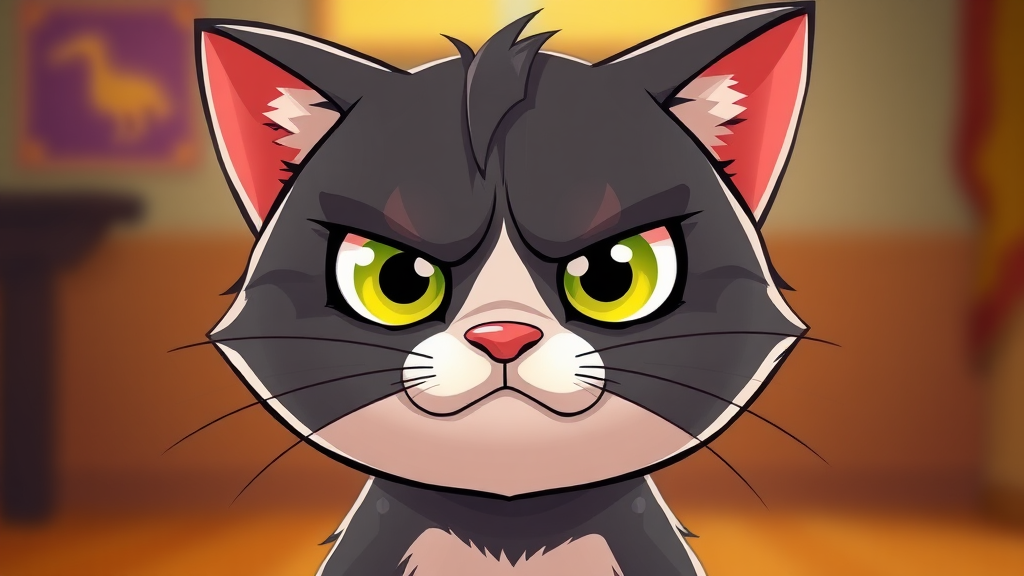 Adorable animated cat with a grumpy expression, staring directly at the viewer, cartoon style illustration with vibrant colors and playful features.