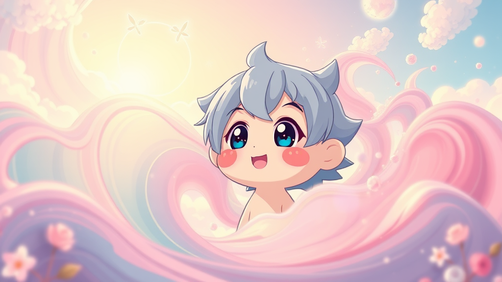 Adorable anime mascot melting into a swirl of pastel colors, merging seamlessly with a dreamy pastel landscape, radiating happiness and warmth, bathed in gentle, golden light, inspired by the illustrative style of Bryan Hitch, captured from a low angle, gazing directly into the viewer, surrounded by magical, fairytale scenery with a hint of lens flare.