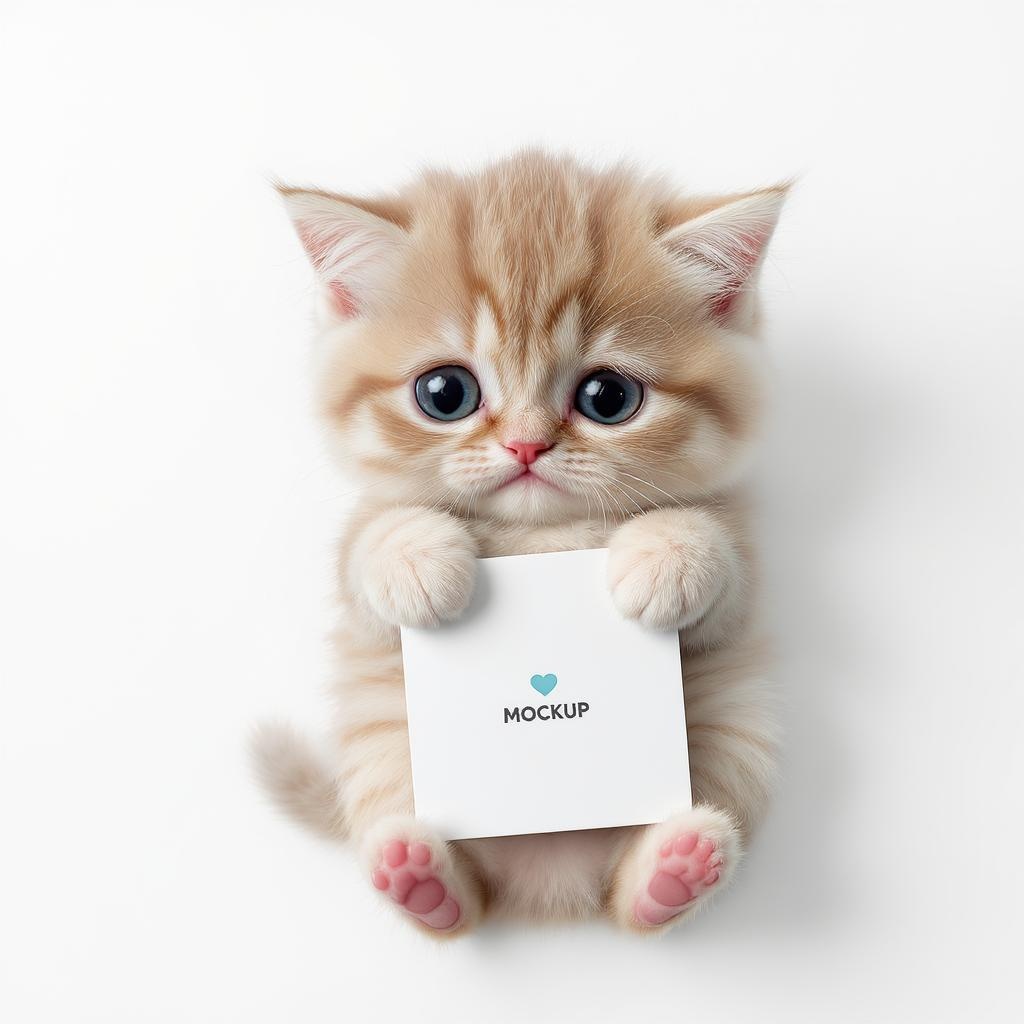 Adorable baby kitten with large, sorrowful eyes, grasping a flat lay mockup of a design, set against a simple background. Photographed in a flatlay style with minimalistic design, using professional studio lighting in an overhead shot. This hyper-realistic portrayal captures a chibi animal with maximum detail.