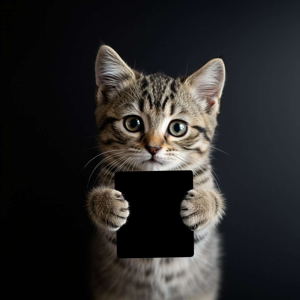 Adorable baby kitten with large, soulful eyes, clutching a flat lay mockup, set against a sleek, minimalistic backdrop in flatlay photography style with expert studio lighting; captured from an overhead perspective, hyper-realistic detail, featuring a chibi animal aesthetic with maximum detail enhancement.