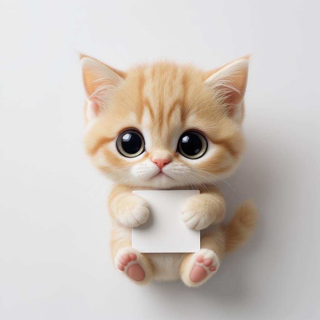 Adorable baby kitten with oversized, expressive eyes gazing wistfully, clutching a flat lay mockup of a delicate object, set against a serene backdrop with flatlay photography style, showcasing minimalist design, professional studio lighting illuminating an overhead shot from above, hyper-realistic detail capturing chibi animal essence, enhanced with intricate features.