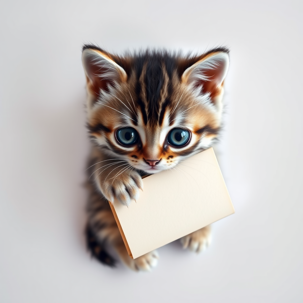 Adorable baby kitten with oversized, melancholic eyes, clutching a flat lay mockup of a book, set against a simple and clean background, captured in the flatlay photography style with a minimalistic approach. Shot in professional studio lighting from an overhead perspective, the scene is hyper-realistic, featuring a chibi-style animal with highly detailed features enhanced to the fullest.