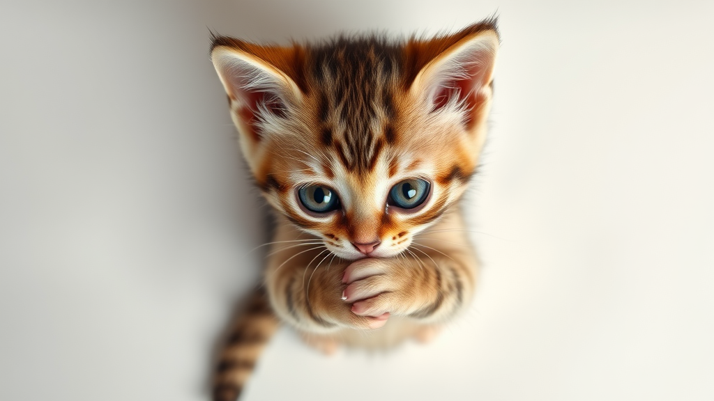 Adorable baby kitten with oversized, melancholy eyes, clutching a flat lay mockup, set against a simple background, captured in flatlay photography style, featuring minimalistic design and expert studio lighting, viewed from above in a hyper-realistic, chibi-inspired manner, with an emphasis on intricate details.