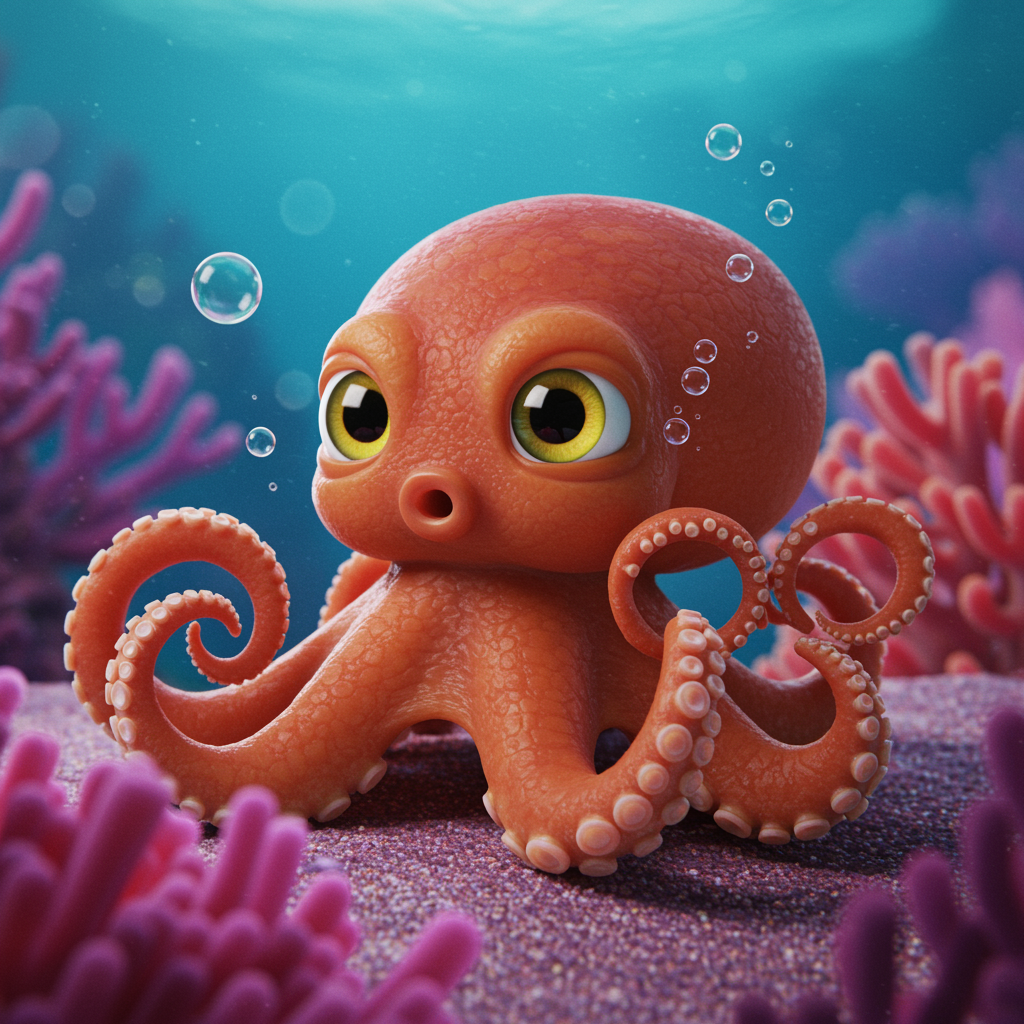Adorable baby octopus with big, expressive eyes nestled in a vibrant underwater setting, in a whimsical, Pixar-inspired style, surrounded by playful bubbles and colorful coral, exuding charm and irresistible cuteness with a touch of magical whimsy.