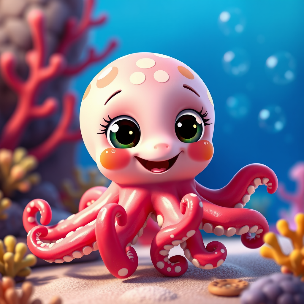 Adorable baby octopus in a Pixar-inspired style, overflowing with charm and cuteness, vivid colors and expressive eyes, playful tentacles and a joyful demeanor, set against a whimsical underwater backdrop with colorful coral and shimmering sea bubbles.