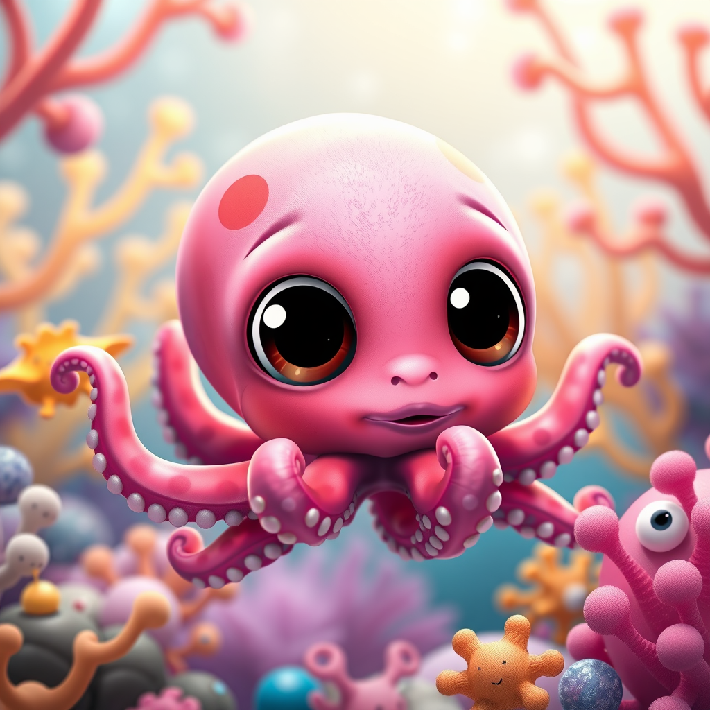 Adorable baby octopus rendered in a vibrant Pixar-like style, featuring large, expressive eyes and tiny, charming tentacles; surrounded by a colorful underwater world with playful sea creatures, enhancing the cuteness overload with a delightful and whimsical atmosphere.