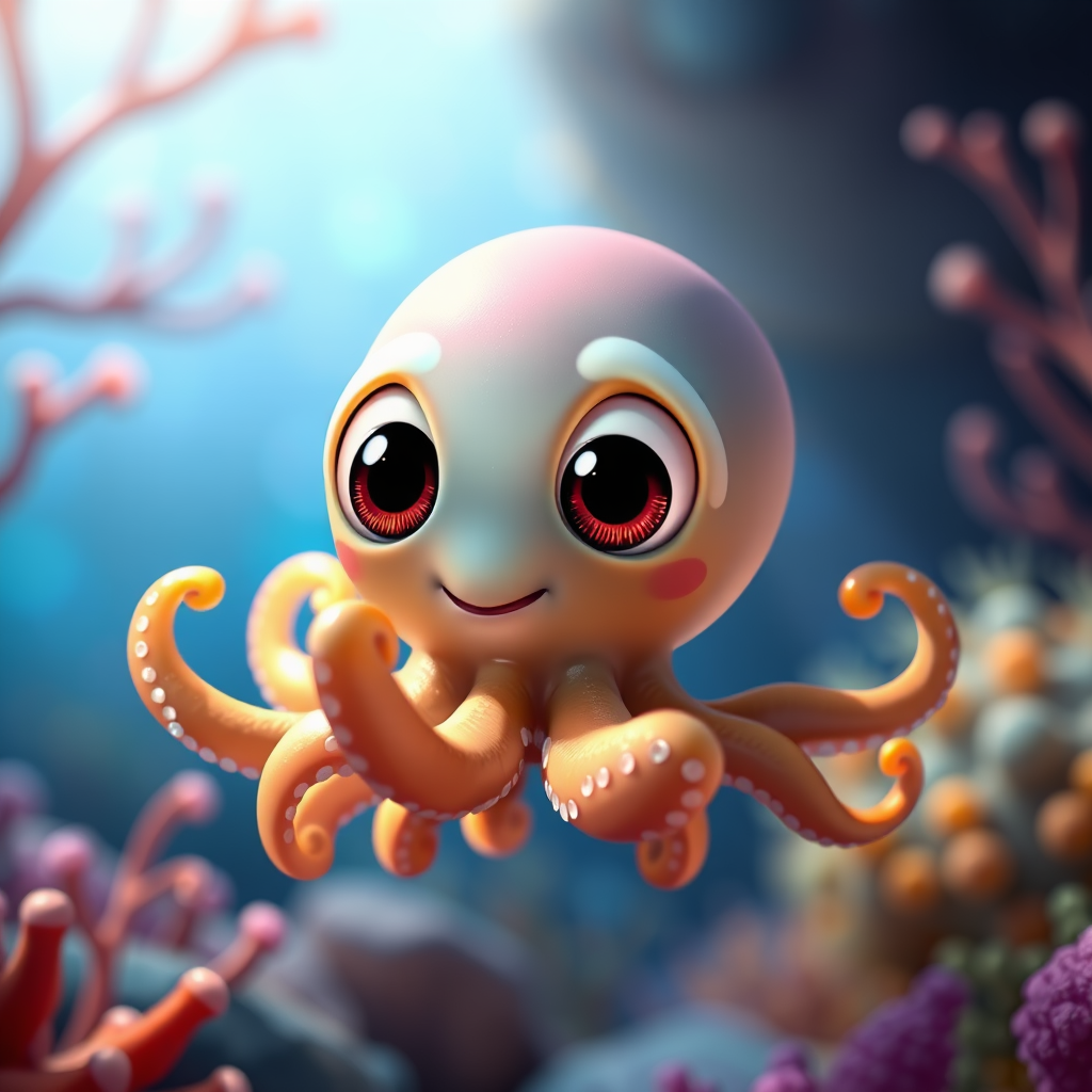 Adorable baby octopus with big, expressive eyes glimmers in a colorful underwater world, its tentacles playfully swaying as it explores its vibrant surroundings with innocent curiosity, embodying the charm and whimsical animation style reminiscent of a Pixar film, filled with cuteness overload and a splash of magical wonder.