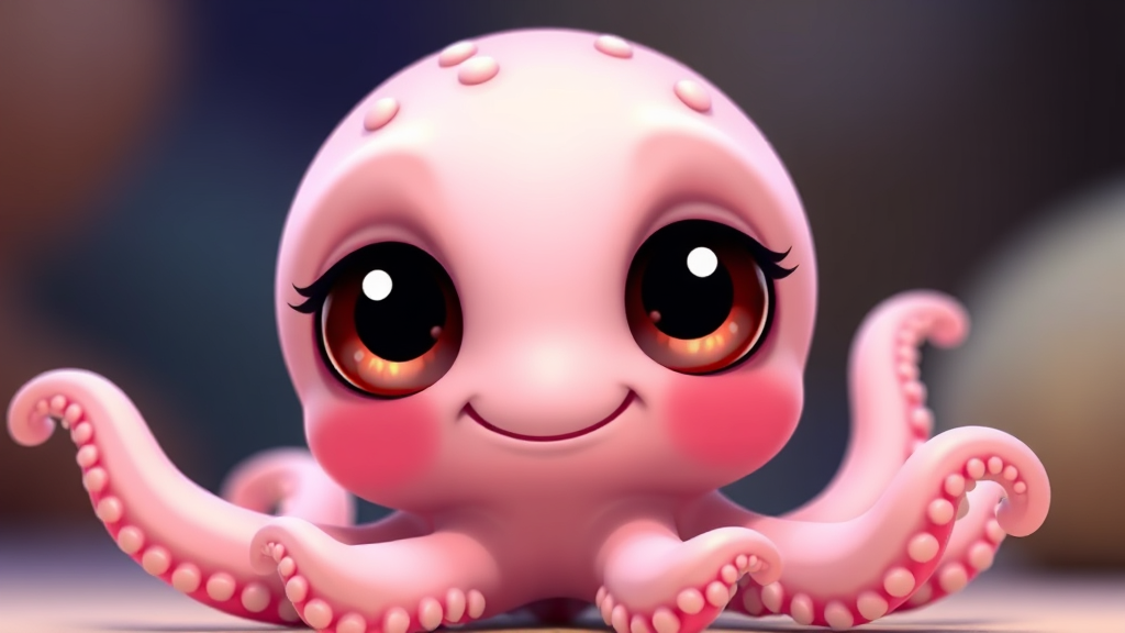 Adorable baby octopus with expressive, oversized eyes and a playful smile, rendered in a vibrant, Pixar-inspired animation style, exuding an irresistible charm and whimsical appeal with gentle pastel hues and smooth textures.