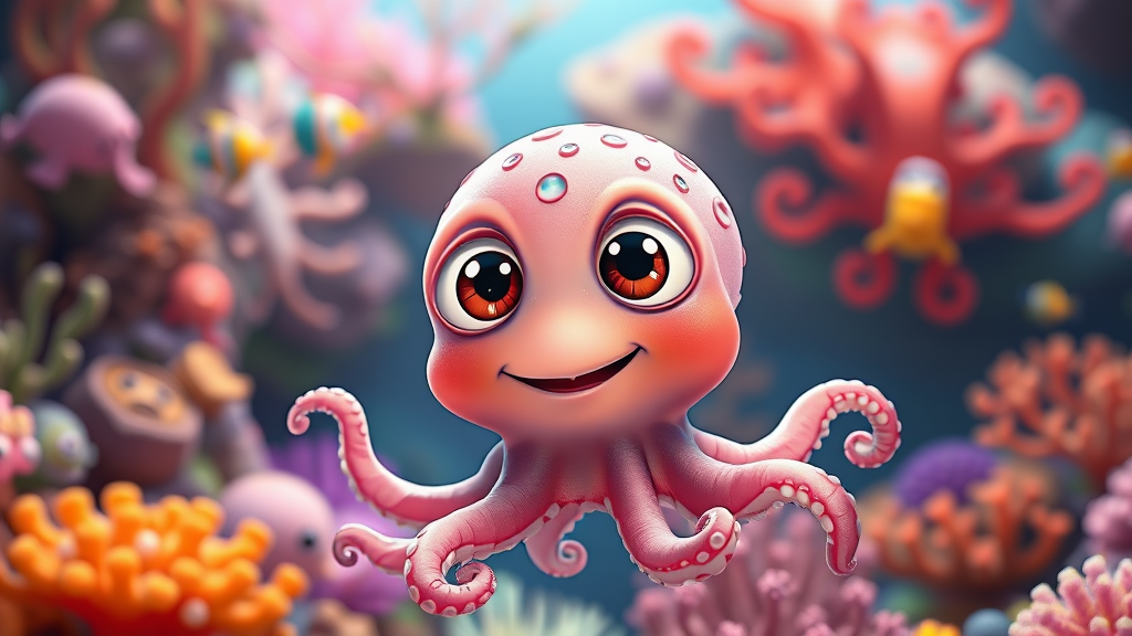 Adorable baby octopus with oversized expressive eyes, in a colorful underwater world reminiscent of Pixar's charm, radiating cuteness with playful tentacles and a gleaming smile, surrounded by bright, friendly sea creatures and vibrant coral reefs, capturing a whimsical atmosphere of underwater delight.