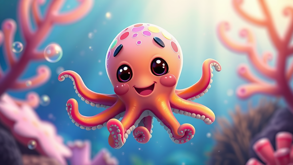 Adorable baby octopus with vibrant colors, in the whimsical and heartwarming style of Pixar, a delightful overload of cuteness with playful expressions and endearing gestures, set against a colorful underwater world with gentle light beams and bubbles.
