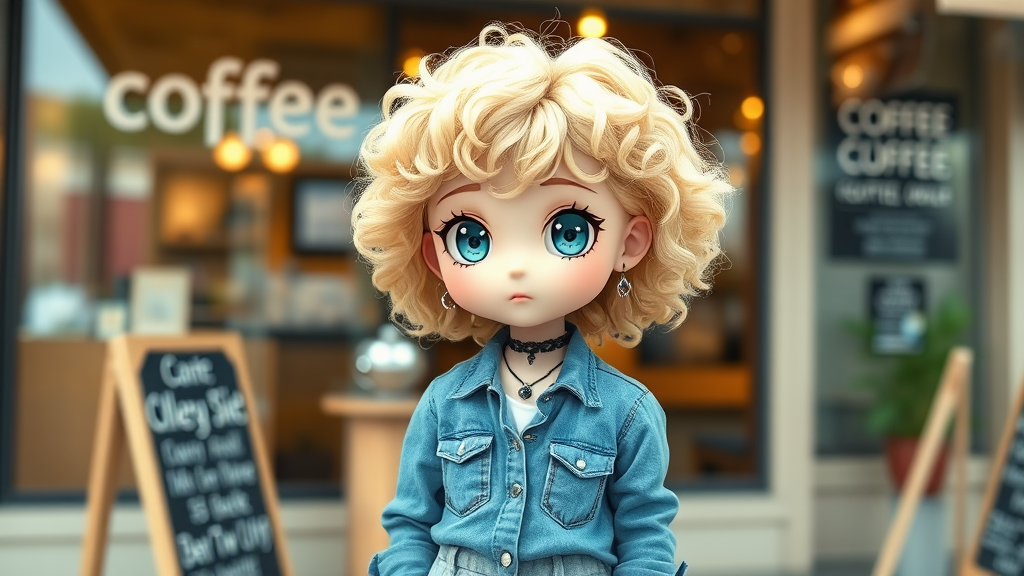 Adorable blonde girl in a cute outfit standing outside a coffee shop, full body, chibi style, with bright crossed eyes; she's wearing a denim shirt and has curly hair adorned with a goth necklace and earrings. The background is softly blurred to emphasize her presence, although the image features some charming imperfections like low resolution and slight blurriness. Despite the artistic quirks, there's a unique charm to the composition with its playful depiction and cute, slightly exaggerated features.