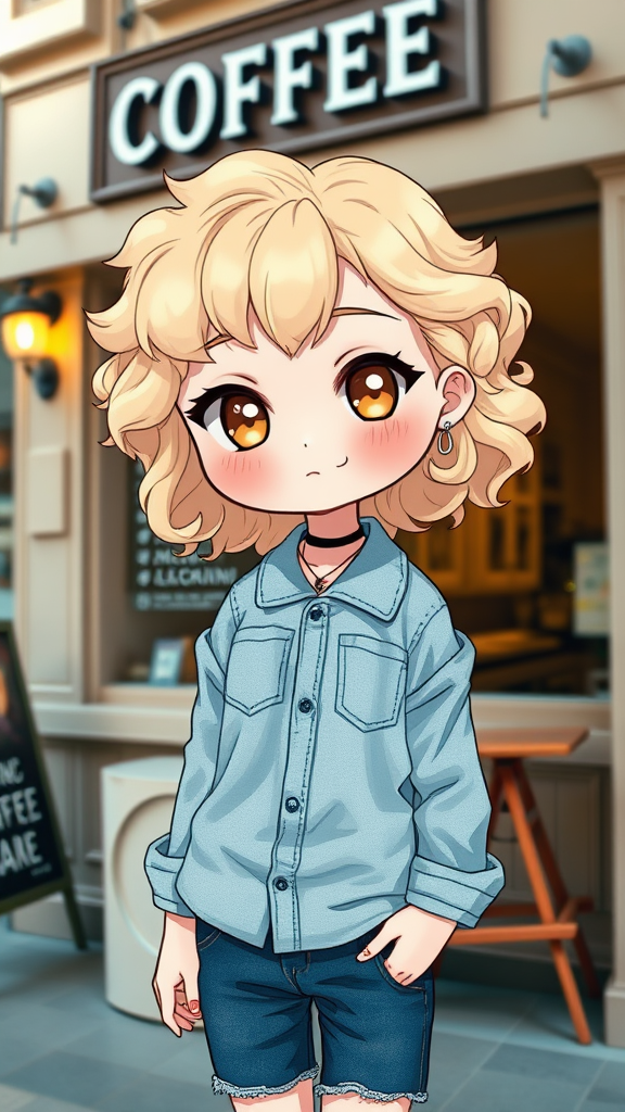 Adorable blonde girl standing outside a charming coffee shop, wearing a cute, stylish outfit. Full-body depiction with a chibi art style. Despite playful crossed eyes, the image possesses a dreamy quality, capturing the whimsical essence of a doll-like character. Curly hair frames her face, complementing her denim shirt. She accessorizes with subtle goth-style jewelry, including a necklace and small loop earrings. In the background, a slightly blurred scene adds to the focus on the character while maintaining an air of mystery. The overall image conveys a blend of fun, curiosity, and artistic flair.