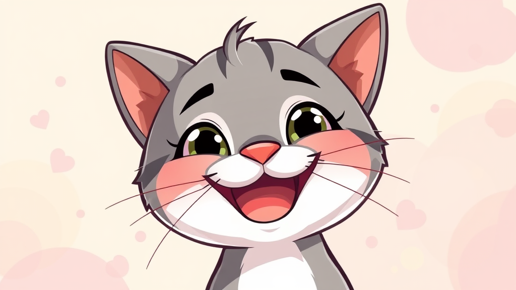 Adorable cartoon cat grinning at the viewer, illustrated in a playful and vibrant vector style, with eyes sparkling and a whimsical background.