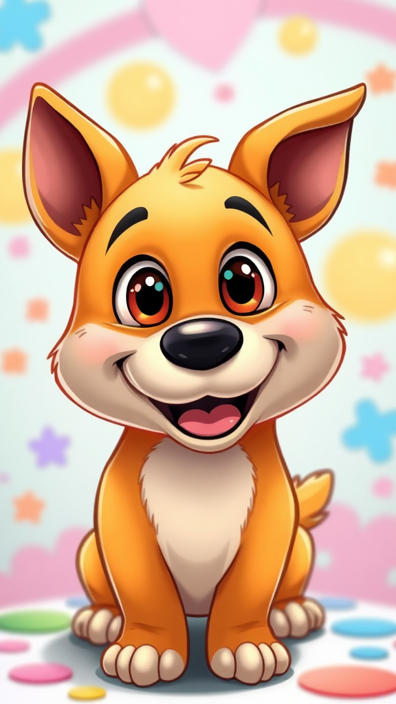 Adorable cartoon dog with big, bright eyes and a beaming smile, playfully looking at the viewer, surrounded by a colorful, whimsical background.
