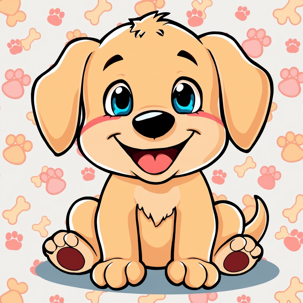 Adorable cartoon puppy sitting with a cheerful grin, bright eyes sparkling with joy, surrounded by a playful pattern of bones and paw prints in a vibrant, colorful vector style.