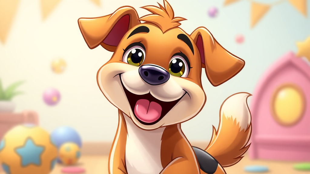 Adorable cartoon-style canine giving a gleeful smile toward the viewer, set against a playful, colorful backdrop, with shiny eyes and a wagging tail capturing its joyful spirit.