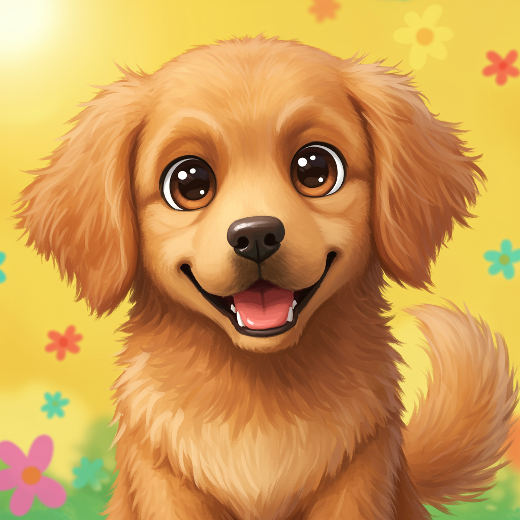 Adorable cartoon-style dog gazing joyfully at the viewer, with a vibrant and playful atmosphere.