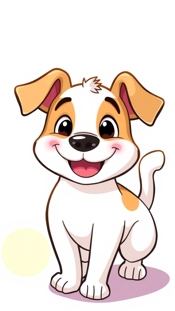 Adorable cartoon-style illustration of a cheerful dog grinning at the viewer, featuring a playful wagging tail and big, expressive eyes, with a bright and colorful background adding a lively touch.