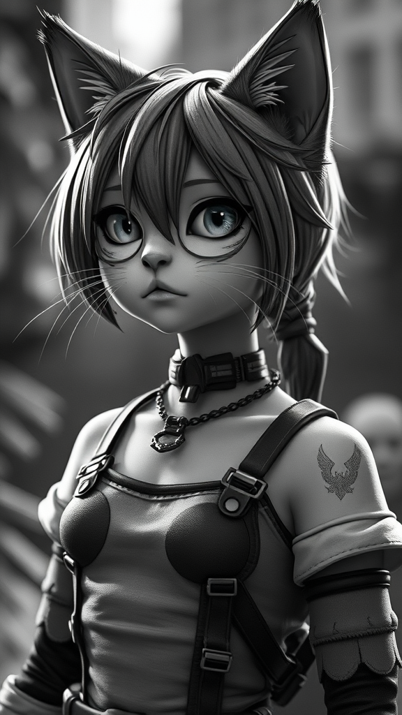Adorable cat girl depicted in a style reminiscent of Yoji Shinkawa and Guweiz, infused with the distinctive aesthetic of Borderlands. Rendered using Unreal Engine and Octane Render for high-quality visuals, featuring depth of field, 8K UHD resolution, and raytracing for enhanced cinematic lighting. The scene is presented in a monochrome grayscale palette, adding a unique visual layer. Artistic elements include text and logo, with a cropped composition that maintains focus. Technical quality includes occasional visual quirks such as low resolution effects, minor jpeg artifacts, slight blurriness, and abstract distortions that lend character. The anatomy maintains creativity without conforming to realistic standards - extra limbs or elongated features may appear, adding to the avant-garde portrayal without compromising the core concept of a cute cat girl.