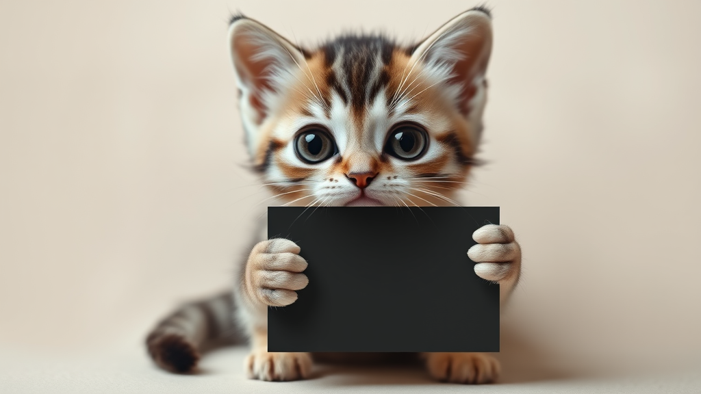 Adorable chibi kitten with oversized, soulful eyes clutching a flat lay mockup of a design, set against a softly blurred background, featuring minimalist style, captured with professional studio lighting from an overhead perspective, hyper-realistic detail emphasizing its expressive features.