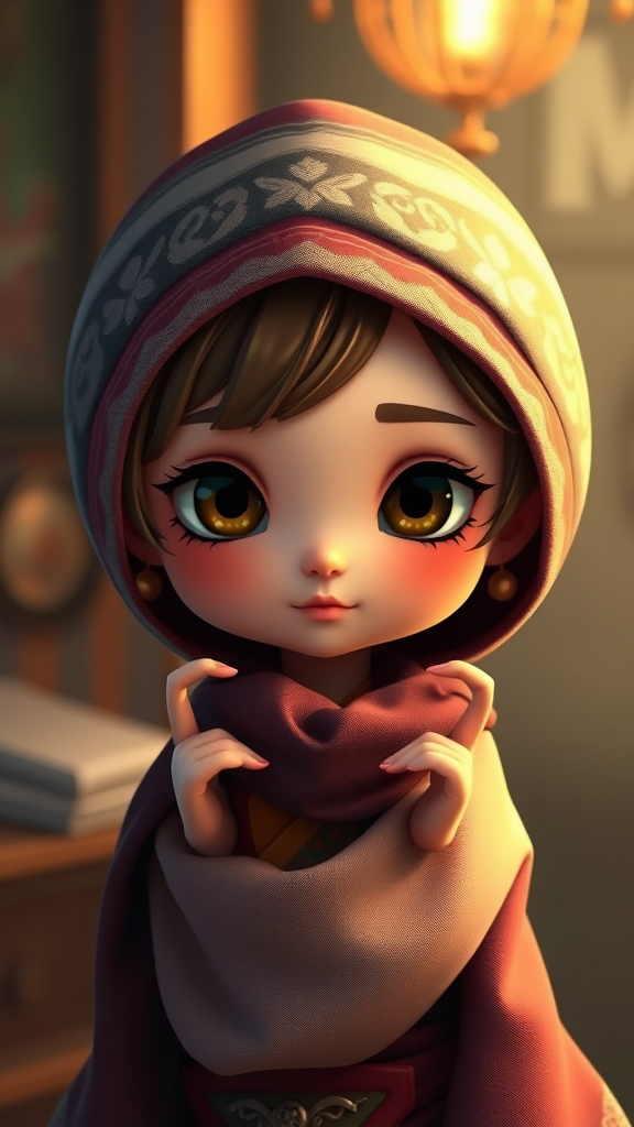 Adorable chibi portrait featuring a head scarf, captured in a cinematic style with ambient lighting, showcasing intricate and ornate details, rendered in 8k UHD HDR quality. The character possesses a unique charm with a subtle mutation, having a longer than usual neck and additional fingers on delicately mutated hands. Despite this, the overall composition remains cohesive, with attention to detail ensuring the mutations feel natural within the whimsical context. The visual is slightly off-center and intentionally retains a playful, cartoon-like essence, characterized by elements like crossed eyes that add to the charm. Emphasis is placed on soft textures, avoiding harsh lines, and maintaining a clean, artifact-free presentation, ensuring no letters, logos, or text distract from the main subject. The style embraces the aesthetics of animated art while experimenting with slight offbeat traits to enhance the originality.