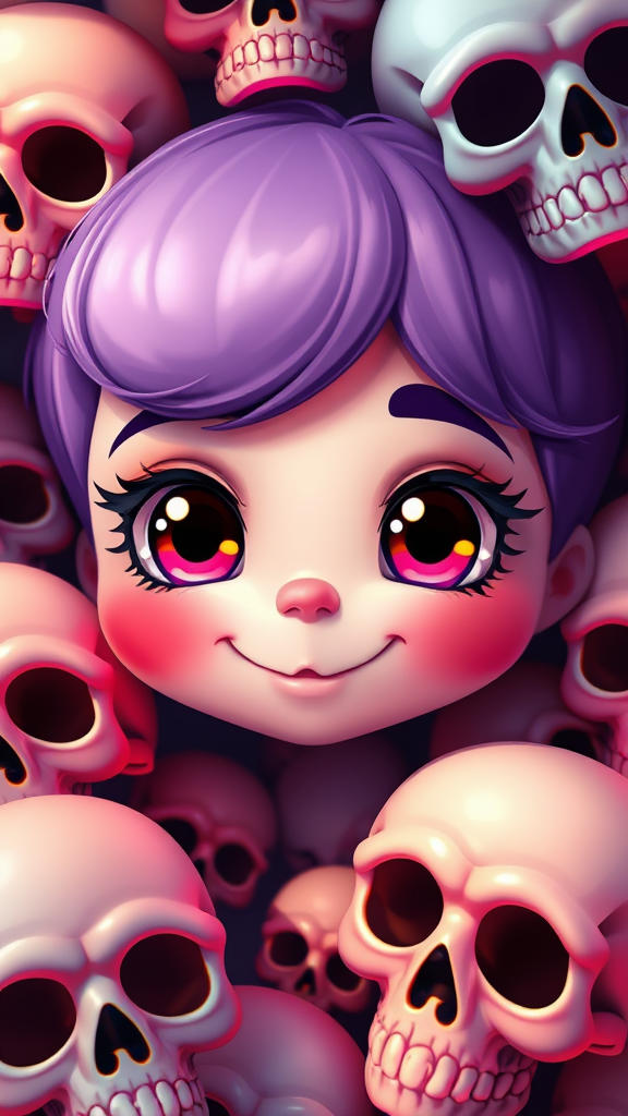 Adorable digital art piece featuring a close-up of a whimsical cartoon character surrounded by vibrant, stylized skulls. Inspired by the detailed and cute styles of Lois van Baarle, Rossdraws, and Beeple, the character displays a playful expression with large, expressive eyes and a quirky smile. The scene is enriched with vibrant colors and intricate patterns, reflecting the influences of Jeremiah Ketner and Artgerm. The character exhibits a smooth, 3D-like finish reminiscent of Ross Tran's global illumination style, with a focus on soft lighting and delicate shading. This delightful composition captures a sense of charm and wonder, blending the unique artistic flair of Loish and Rossdraws in a captivating digital painting.