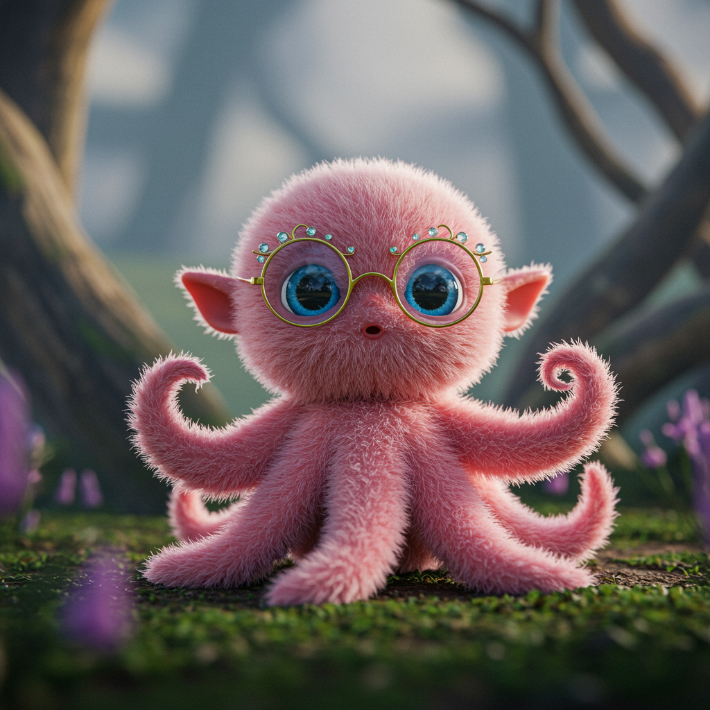 Adorable extraterrestrial baby creature with enchanting glasses, mystical and whimsical, ultra-cute, rendered in octane, 8k resolution, set in an elaborate fantasy landscape, vibrant and dreamlike colors, hyper-realistic, plush and feathery texture, exceptional quality, with a futuristic charm, resembling a small, charming octopus with fluffy tendrils, childlike innocence.