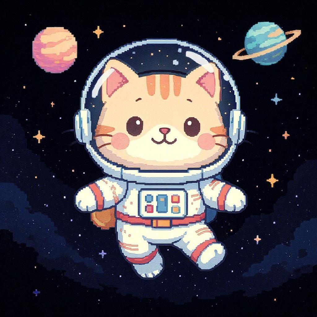 Adorable feline astronaut floating in space, pixel art style, wearing a charming, colorful space suit with tiny star patterns, surrounded by twinkling stars and distant planets, with a cheerful expression on its face.