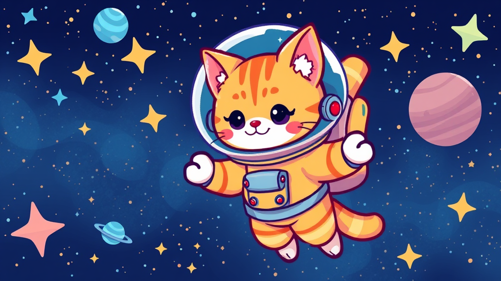 Adorable feline cosmonaut floating among stars in a retro pixel art style, wearing a brightly colored space suit with twinkling galaxies and planets in the background.