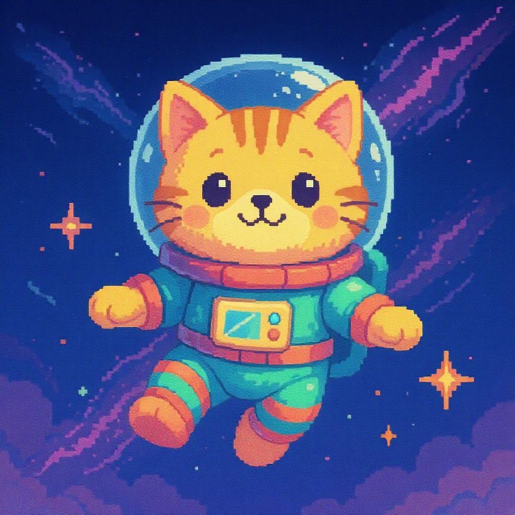 Adorable feline in a colorful space suit floating amidst cosmic stars, retro pixel art style.