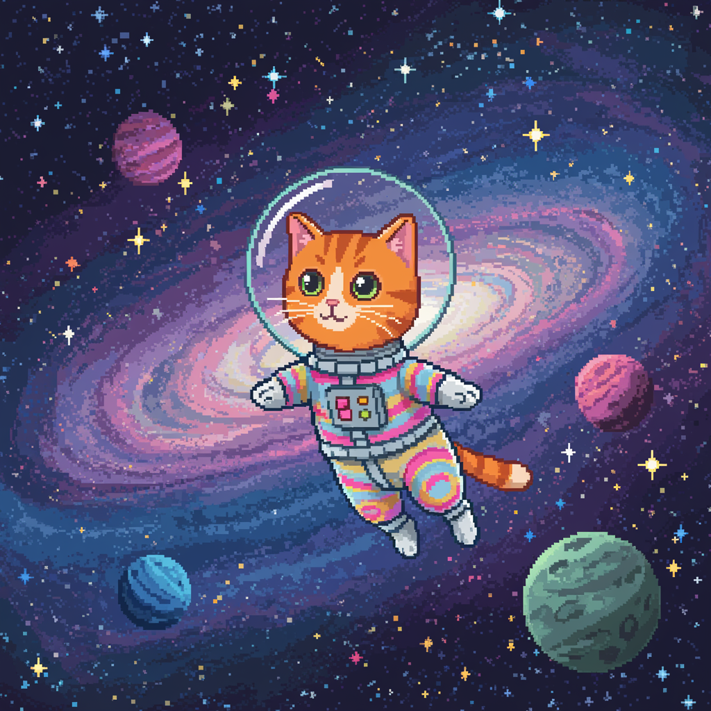 Adorable feline in a colorful spacesuit floating amidst a whimsical galaxy, surrounded by twinkling stars and distant planets, crafted in vibrant pixel art style.