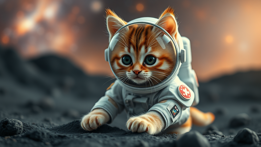Adorable feline in a space explorer suit, hyper-realistic, ultra-HD, exploring a cosmic landscape with curious eyes and fluffy paws.