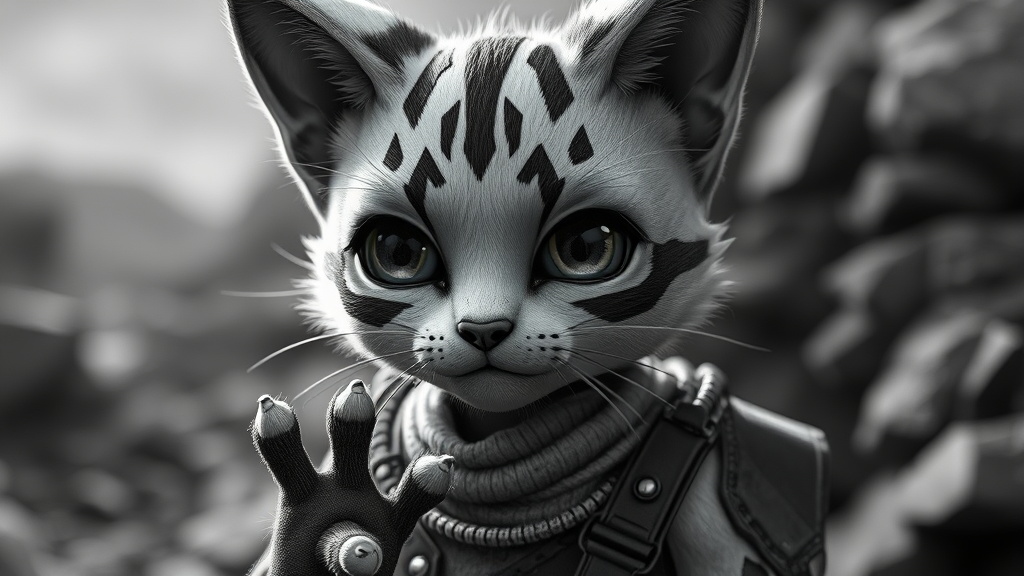 Adorable feline-inspired character crafted by Yoji Shinkawa and Guweiz, set in a Borderlands aesthetic using Unreal Engine with Octane render. Features include depth of field, ray tracing for cinematic lighting, and rendered in stunning 8k UHD. The character is depicted in an engaging monochrome palette, carefully avoiding imperfections such as blurriness, deformation, or poor anatomy. The focus is on high quality, well-proportioned design without extra or mutated limbs. The details highlight a perfectly drawn face, hands, and fingers, maintaining artistic integrity and craftsmanship within a fully composed frame.