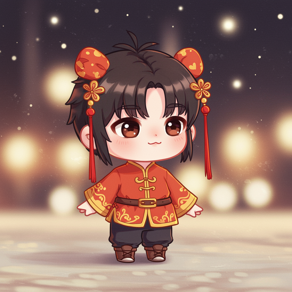 Adorable flat illustration of a cute Chinese idol with a close-up 3D effect, featuring a tiny, charming presence with depth of field and a captivating bokeh background. The hyper-detailed, playful composition follows the golden ratio, offering a full-length view from a POV perspective. This cartoon-style image radiates a cozy and fun atmosphere, ideal for a wallpaper in soothing pastel colors.