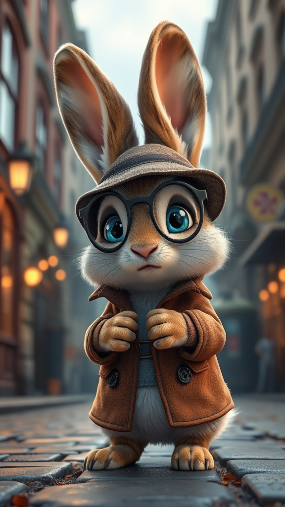 Adorable fluffy bunny cub dressed as Sherlock Holmes, with bright blue eyes, solving a mystery in old London. Pixar-style with ultra-detailed textures and vivid colors, capturing a cinematic feel with realistic lights. The scene showcases a charming London backdrop from an animated film, achieving perfect composition and sharp focus. Soft natural volumetric lighting enhances the photorealistic concept art, rendered in Unreal Engine, with a boost to the cinematic appeal. The bunny's curious gaze and expressive features add a whimsical touch to this imaginative scene.