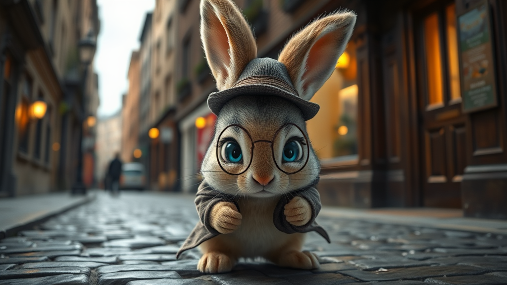Adorable fluffy bunny cub with twinkling blue eyes dressed as Sherlock Holmes, keenly investigating a mysterious crime scene. The setting is the cobblestone streets of old London, portrayed with Pixar-style animation, offering ultra-detailed visuals. The scene is alive with realistic lighting and cinematic studio photo quality, featuring vivid colors that highlight every detail. Sharp focus and photorealistic concept art bring this charming detective tale to life, with perfect composition and soft natural volumetric elements. The cinematic lighting is flawlessly executed, rendered beautifully in Unreal Engine to boost the immersive experience.