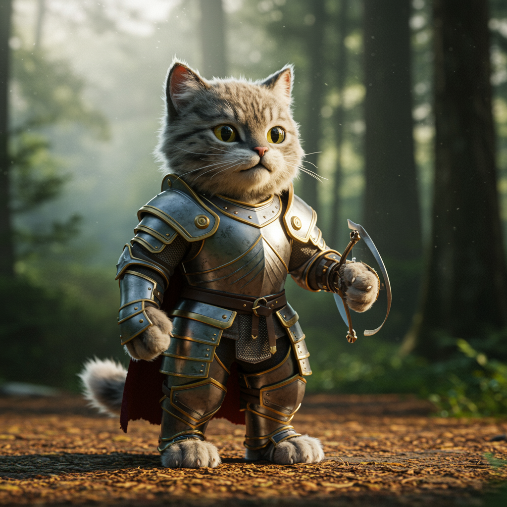 Adorable fluffy feline champion clad in intricate gleaming armor, photorealistic, 4K resolution, hyper-detailed, vray rendering, powered by Unreal Engine, featuring fluid fur movement and lifelike metallic textures, set against a mystical forest backdrop with dappled sunlight filtering through the trees, conveying a sense of adventure and bravery.