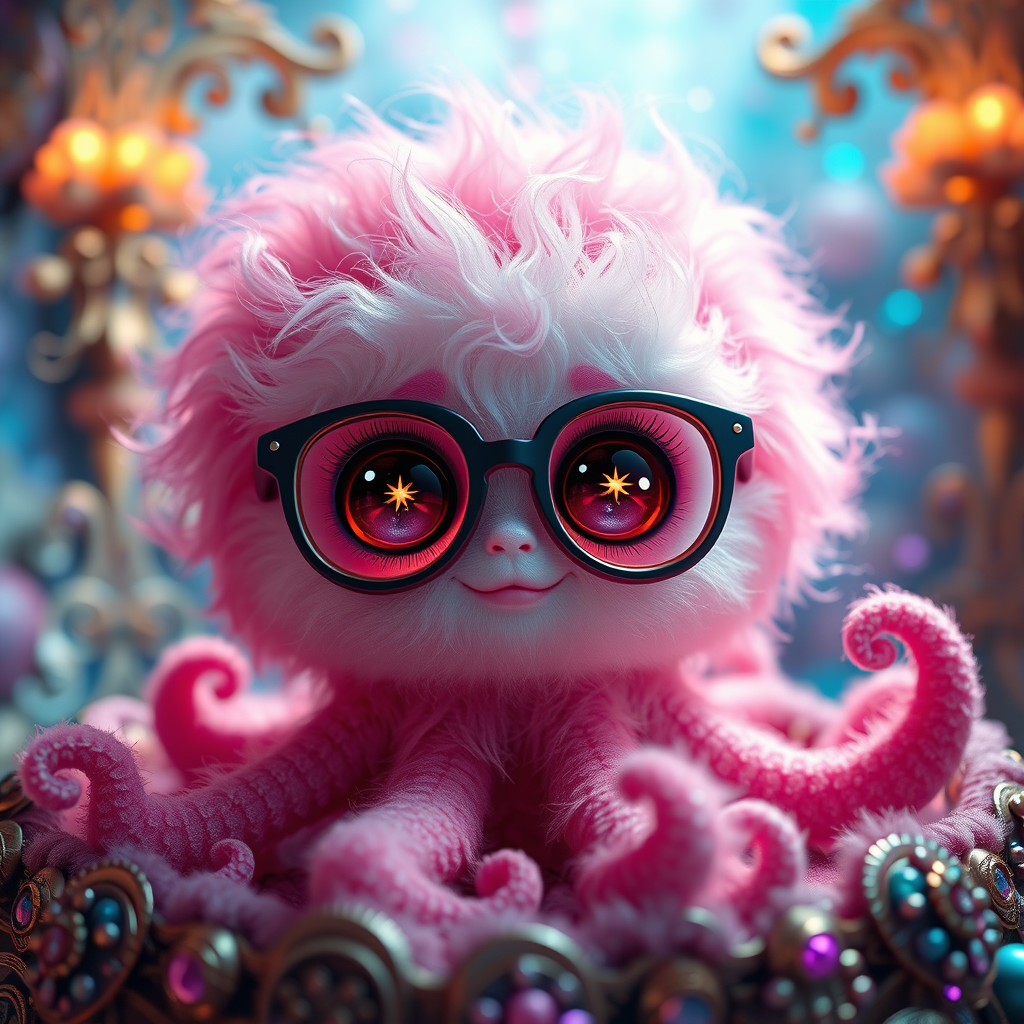 Adorable intergalactic infant creature with twinkling eyes behind tiny glasses, emanating a magical and ethereal aura, exuding cuteness, captured with octane render in stunning 8k. Nestled in an ornate, dreamlike setting filled with vibrant fantasy colors, this ultra-realistic creation has an irresistibly fluffy and soft texture. Envisioned as a futuristic marvel, it combines the whimsical charm of a small octopus with delicate, fluffy tendrils of hair—a perfect blend of childlike wonder and otherworldly allure.