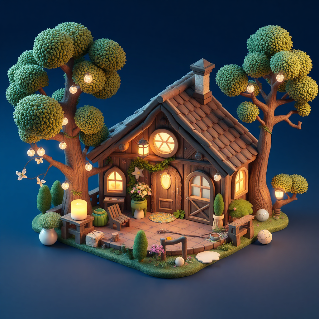 Adorable isometric fantasy woodland cabin, intricately detailed with enchanting decor, featuring gentle illumination and pastel shades, 100mm lens perspective in 3D Blender render, popular on Polycount, inspired by modular constructivism, set against a deep blue backdrop, utilizing physically based rendering techniques, centralized composition with volumetric lighting, cartoonish anime style with sketch elements, low resolution for a charming effect, maintaining normal quality.