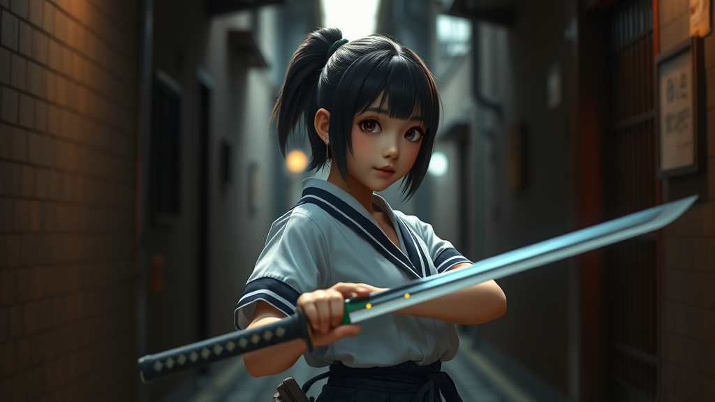 Adorable Japanese high school sophomore in a school uniform holding a sleek katana, standing poised in a dimly lit alley, cinematic flair, 3D rendered using unreal engine, ultra-high-resolution detail at 32k, --ar 9:16, vibrant and dynamic, capturing movement with an expressive, stylized touch and a serene but focused expression.